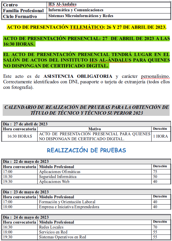 A continuación se muestra el calendario para las Pruebas de Obtención del Título de Sistemas Microinformáticos y Redes.