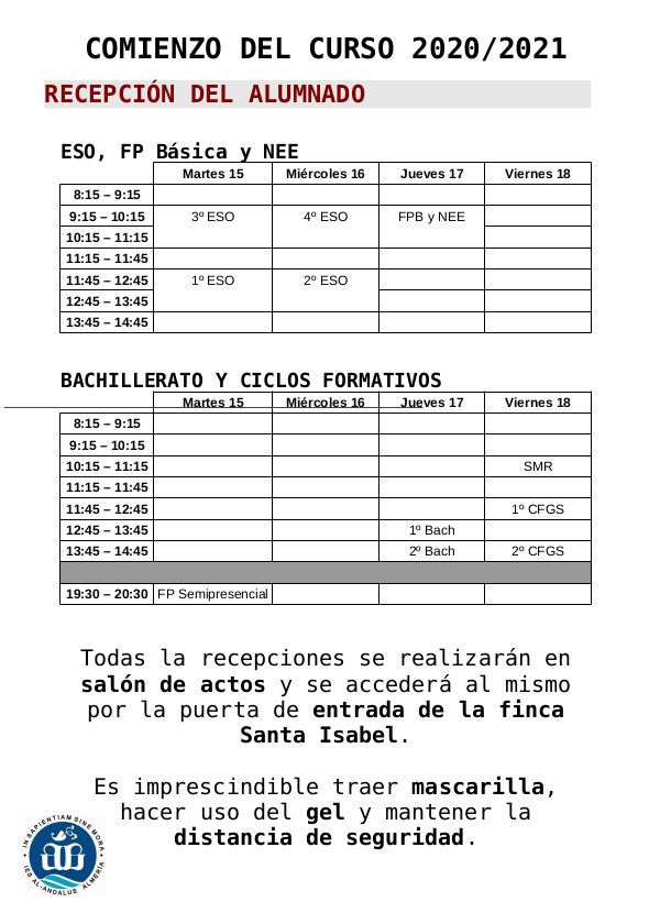 Los grupos de Bachillerato comenzarán las clases el viernes 18 de 9:15 a 12:45 (grupo completo)