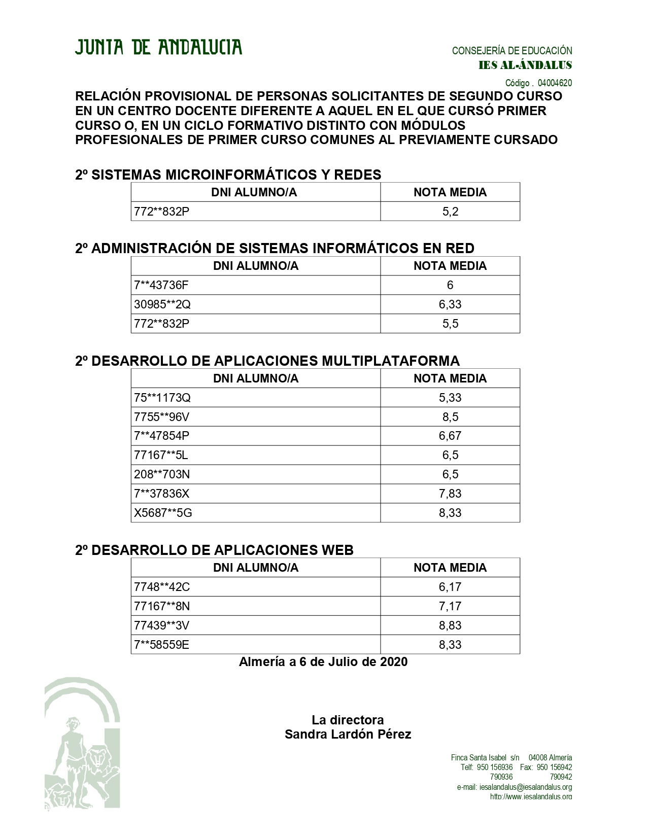 RELACIÓN PROVISIONAL DE PERSONAS SOLICITANTES DE SEGUNDO CURSO EN UN CENTRO DOCENTE DIFERENTE A AQUEL EN EL QUE CURSÓ PRIMER CURSO O, EN UN CICLO FORMATIVO DISTINTO CON MÓDULOS PROFESIONALES DE PRIMER CURSO COMUNES AL PREVIAMENTE CURSADO