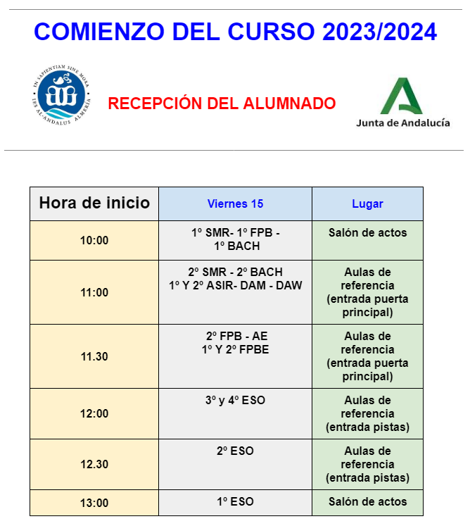 - Las clases comenzarán el LUNES 18 de septiembre en sus respectivas aulas en el horario habitual (8:15- 14:45).